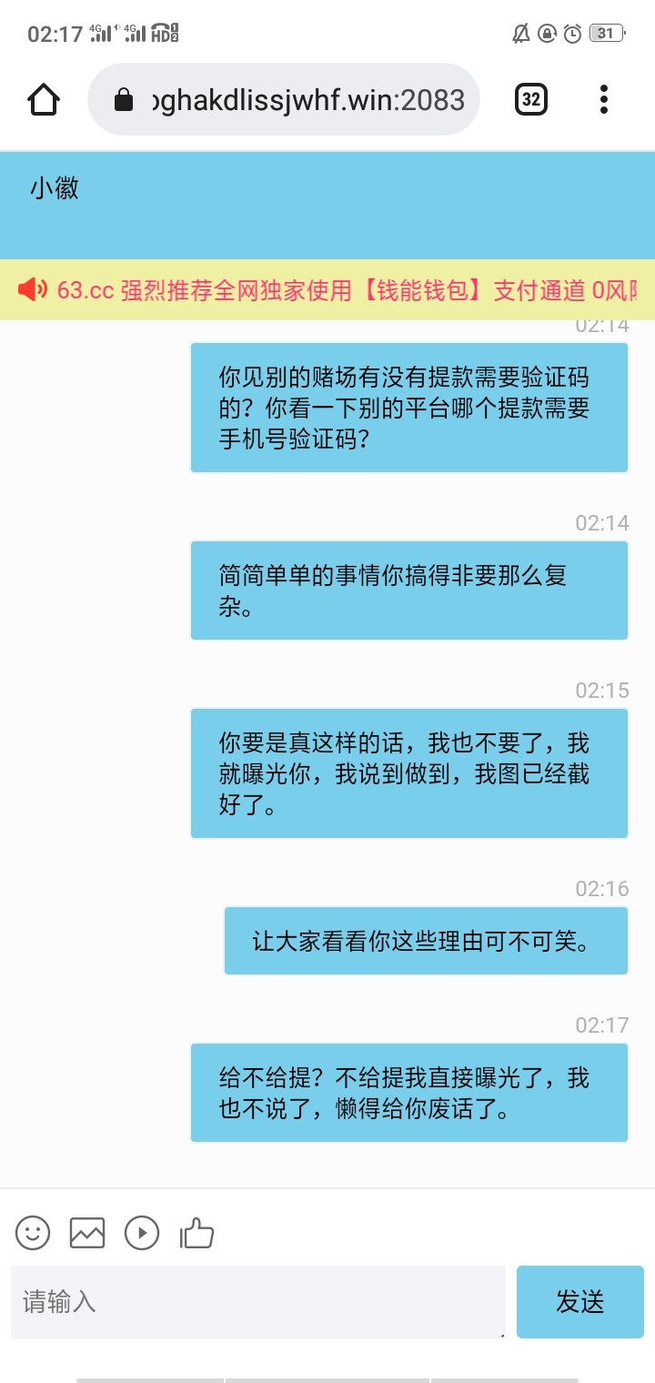 我这个账号注册有一年多了,今天登陆有25块钱彩金,我就打了两下打到200,然后提款的时候各种理由刁难。以前好像有人曝光过这个平台黑钱的历史。一点格局都没有,200块钱在那里搞来搞去没有意思。希望让更多的人看到这个黑平台,以后不要来这里玩,大钱必黑。