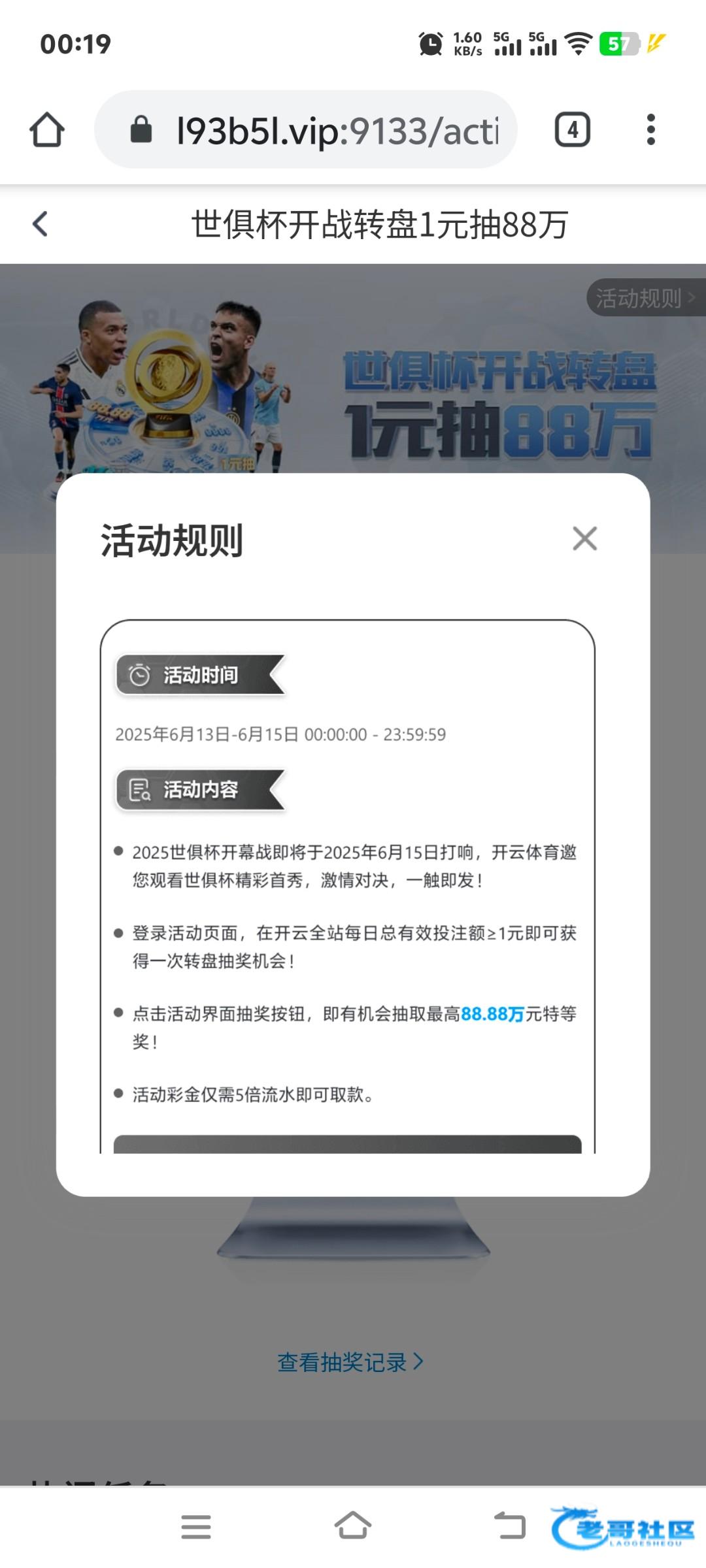 6月13开始,一元投注大转盘抽彩金。网址就是博系名字就能打开。账户有5毛钱即可刷够流水,选择 平台彩票, 即开彩极速赛车。单注选择1厘 冠军2345亚军6789季军67910 连续开奖80次即可够流水。余额仅需要0.5元亲测。投注详情如图。