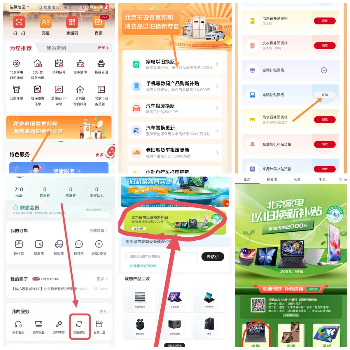 人人能领80~200第一步用微信打开京通进去登录了  第二步用幻影分身把自己的微信地址改到北京(北京任意地方)然后再用分身微信进入京通里面有个北京以旧换新活动 点击领取家电里面的电脑卷复制卷码  第三步下载联想然后去绑定自己的卷 去闲鱼然后挂京通联想卷一般都是80以上  低于80别卖市场价现在150左右一张